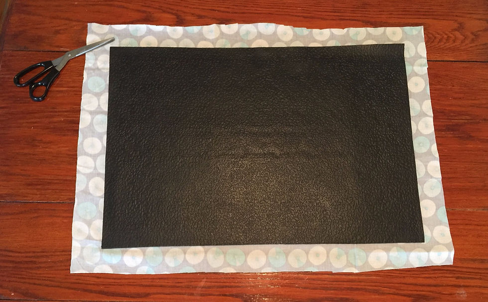 If your rubber mat has a smooth side and a textured side (mine does), apply the spray adhesive to the smooth side of the mat. You could also spray adhesive on the wrong side (underside) of the fabric.